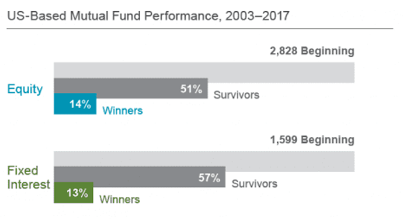 The market’s pricing power works against mutual fund managers who try to outperform through stock picking or market timing. As evidence, only 14% of US equity mutual funds and 13% of US fixed-interest mutual funds have survived and outperformed their benchmarks over the past 15 years.