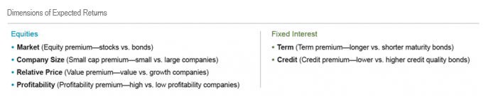 Academic research has identified these equity and fixed interest dimensions, which point to differences in expected returns. Investors can pursue higher expected returns by structuring their portfolio around these dimensions.