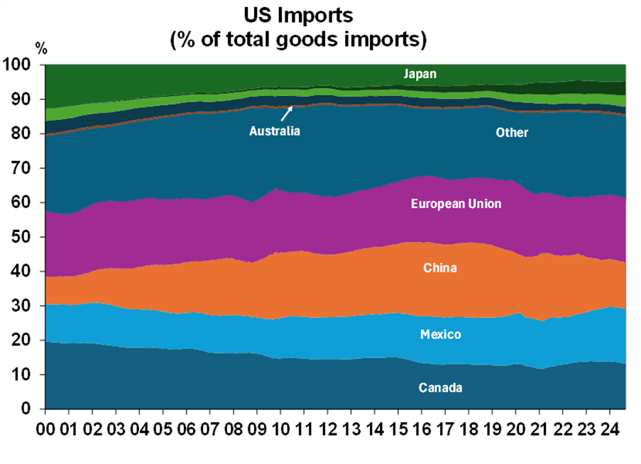 The main indirect impact to Australia and New Zealand from tariffs is from lower commodity prices, as our main trading partner China may see disruption to its growth. China is also likely to push through fiscal spending to offset any economic disruption to which Australian and New Zealand commodities would benefit. There may also be some positive opportunities for Australian and New Zealand businesses to export to the US if the US pivots away from Canada, Mexico and China.